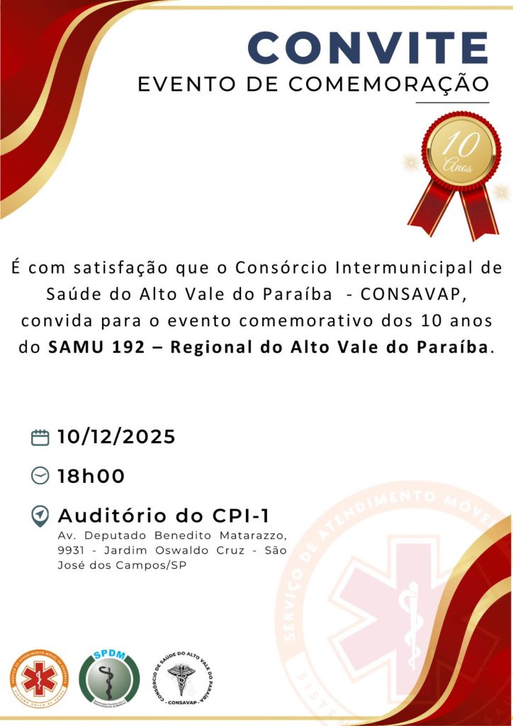 Nesta quarta-feira (10/12), o Consórcio Intermunicipal de Saúde do Alto Vale do Paraíba – CONSAVAP irá realizar o evento de comemoração de 10 anos do SAMU 192 – Regional do Alto Vale do Paraíba, serviço que conta com a atuação de diversos colaboradores da SPDM – Associação Paulista para o Desenvolvimento da Medicina.