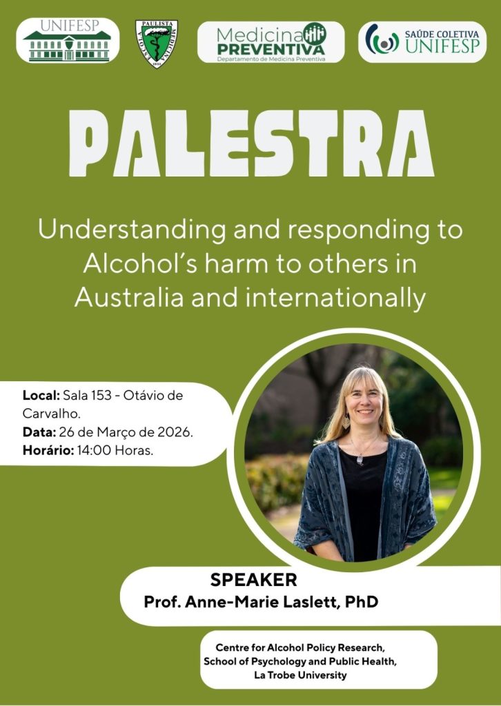 Na próxima quinta (26/03), às 14h, o Departamento de Medicina Preventiva da EPM realiza a palestra Understanding and responding to Alcohol’s harm to others in Australia and internationally, com a Prof. Anne-Marie Laslett, PhD no assunto.