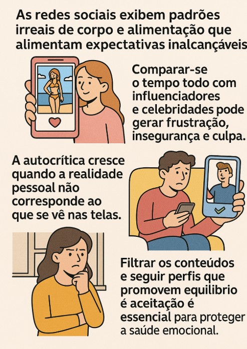 Plataformas digitais frequentemente mostram corpos e hábitos alimentares idealizados, distantes da realidade da maioria das pessoas.