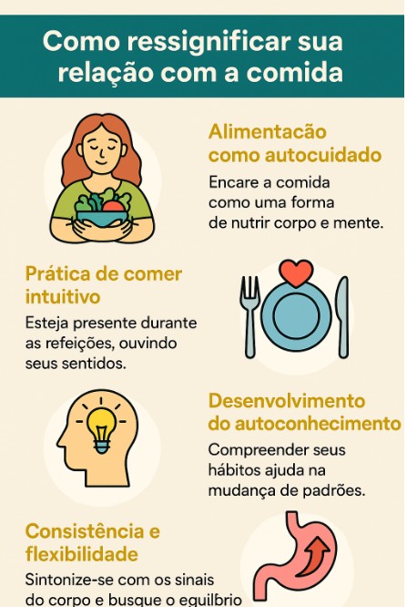 | 1. Papel dos profissionais | Nutricionistas e psicólogos são fundamentais para ajudar na ressignificação da relação com a comida, oferecendo orientação técnica e acolhimento emocional. |