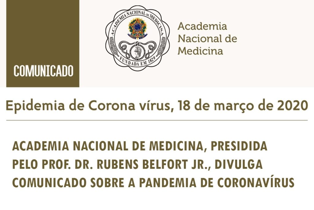 A hora é de extrema gravidade e a Academia Nacional de Medicina, vem elogiar e reafirmar o total apoio ao trabalho da equipe do Ministério da Saúde, reiterando a importância da condução do esforço nacional pelo Ministro, a maior autoridade sanitária do país.Reconhecendo a eficiência dos gestores na luta contra o COVID19, vem, no entanto, manifestar preocupações, apoiar e sugerir ações a serem energicamente implantadas.