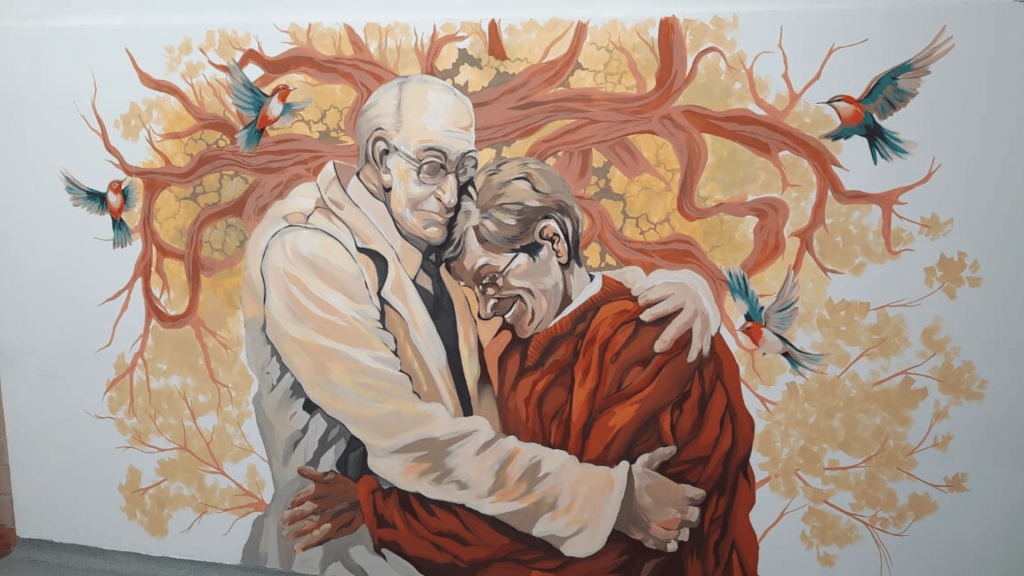 O espaço também foi decorado com um mural inspirado em uma paciente do serviço que viveu mais de 20 anos com ELA. A paciente que foi diagnosticada por volta dos 60 anos, recebeu tratamento e acompanhamento de maneira contínua no ambulatório para lidar com os sintomas da doença.