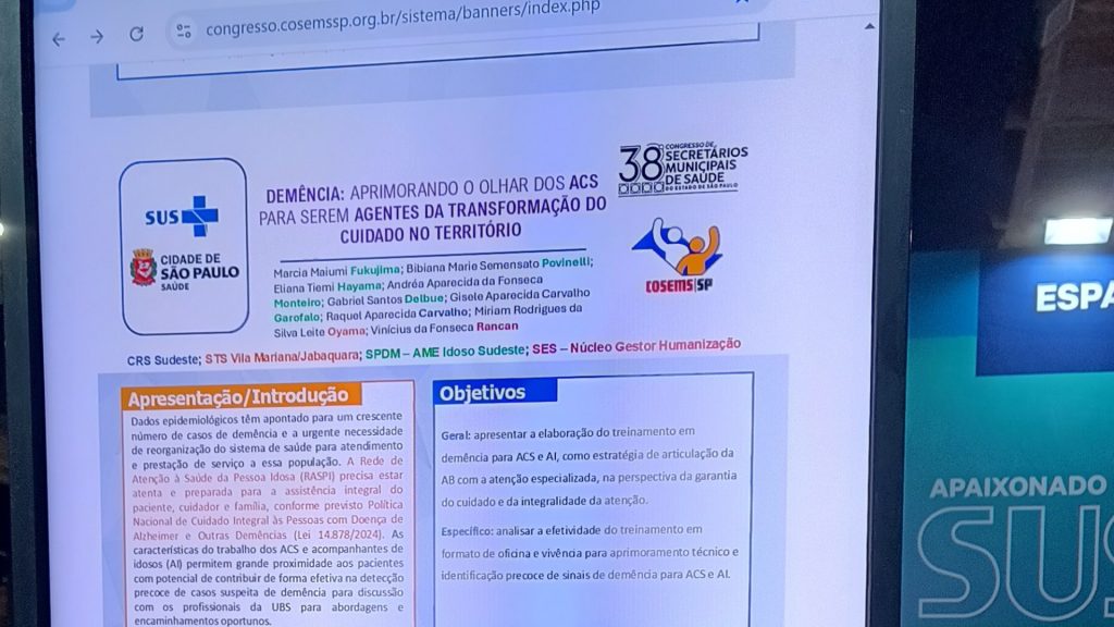 O segundo trabalho, “Demência: aprimorando o olhar dos ACS para serem agentes da transformação do cuidado no território”, apresentado pelo AME Idoso Sudeste, após perceber o aumento de casos de demência, promoveu um treinamento de 8h para 89 profissionais (69 Agentes Comunitários de Saúde e 20 Acompanhantes de Idosos), visando fortalecer a identificação precoce e o cuidado integral no território.