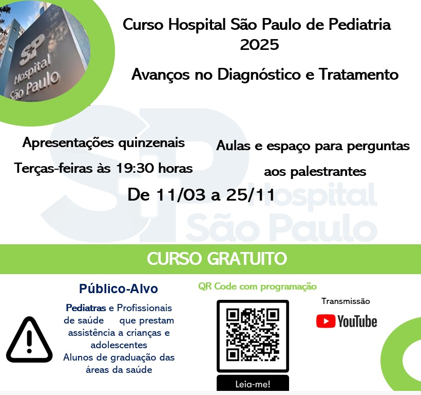 Entre os meses de março e novembro de 2025, o departamento de Pediatria do Hospital São Paulo irá ofertar o curso “Avanços no Diagnóstico e Tratamento” com apresentações quinzenais às terças-feiras, a partir das 19h30.