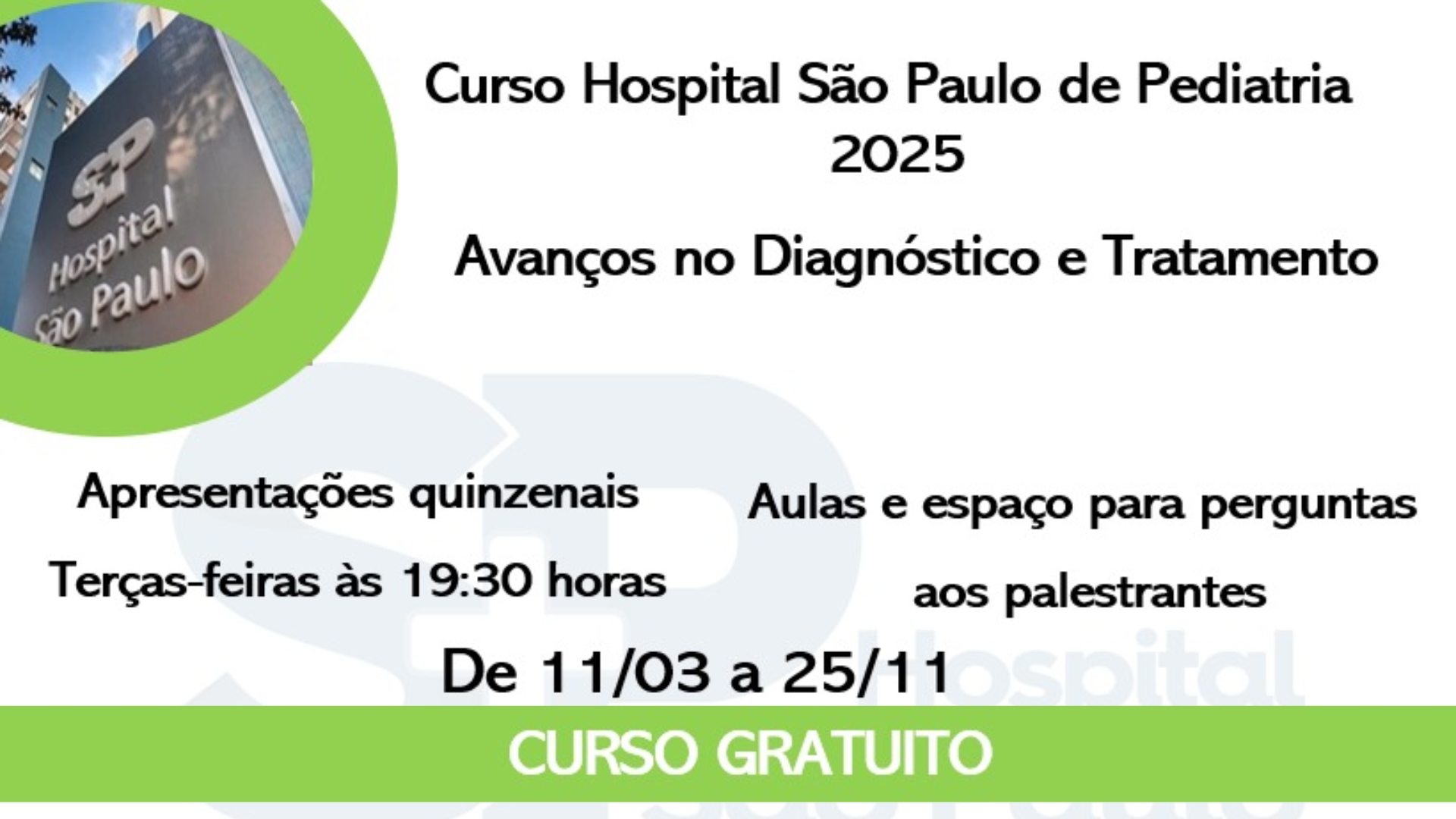 Entre os meses de março e novembro de 2025, o departamento de Pediatria do Hospital São Paulo irá ofertar o curso “Avanços no Diagnóstico e Tratamento” com apresentações quinzenais às terças-feiras, a partir das 19h30.