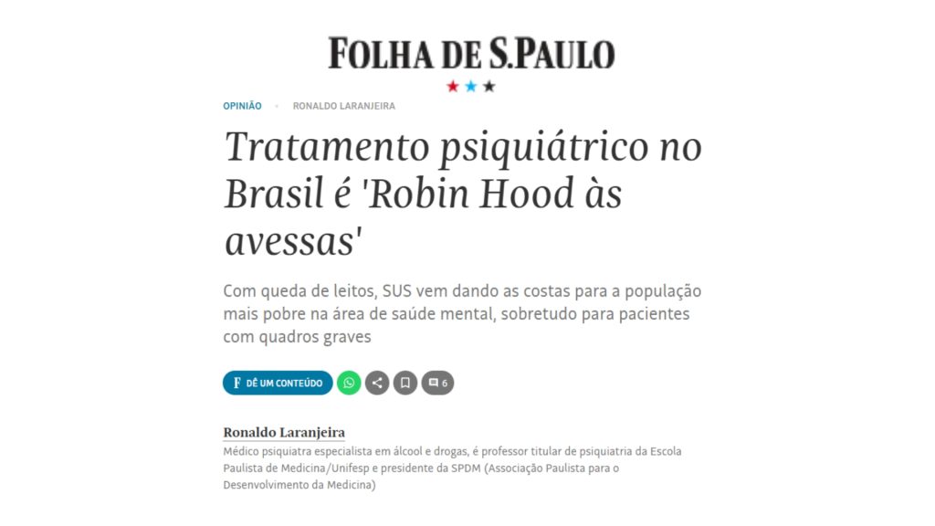 Nesta quarta-feira (30/04), o jornal Folha de S. Paulo publicou o artigo “Tratamento psiquiátrico no Brasil é ‘Robin Hood às avessas’”, no qual o Dr. Ronaldo Laranjeira, diretor-presidente da SPDM – Associação Paulista para o Desenvolvimento da Medicina, discorre sobre a diminuição dos leitos de internação psiquiátrica no Sistema Único de Saúde (SUS), bem como sobre a necessidade de que seja criada uma rede com atendimentos de baixa, média e alta complexidade para que a população mais vulnerável seja atendida em sua totalidade, conforme o quadro clínico e necessidades que apresenta.