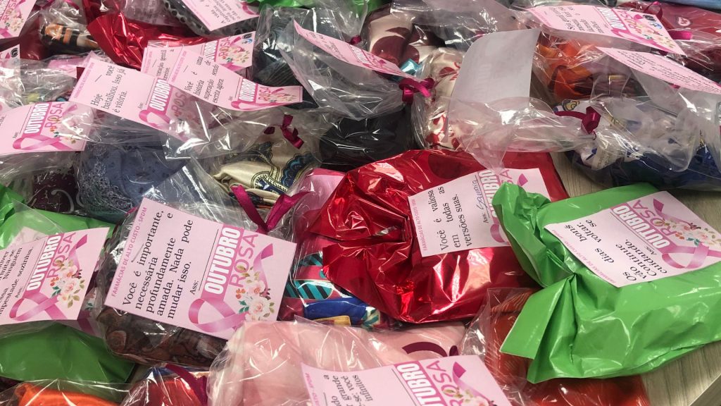 Cada unidade organizou um local de coleta e indicou um responsável para armazenar os lenços durante o mês de outubro. No final do mês, os profissionais que atuam nas Farmácias arrecadaram 113 lenços para incentivar o autocuidado das pacientes que fazem tratamento contra o câncer.