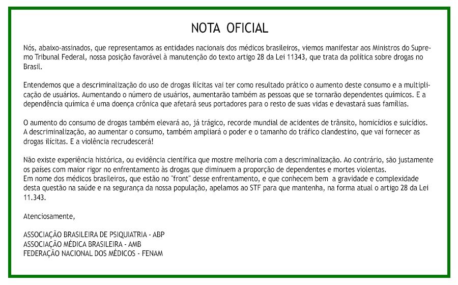 NOTA OFICIALNós, abaixo-assinados, que representamos as entidades nacionais dos médicos brasileiros, viemos manifestar aos Ministros do Supremo Tribunal Federal, nossa posição favorável à manutenção do texto artigo 28 da Lei 11343, que trata da política sobre drogas no Brasil.Entendemos que a descriminalização do uso de drogas ilícitas vai ter como resultado prático o aumento deste consumo e a multiplicação de usuários. Aumentando o número de usuários, aumentarão também as pessoas que se tornarão dependentes químicos. E a dependência química é uma doença crônica que afetará seus portadores para o resto de suas vidas e devastará suas famílias.O aumento do consumo de drogas também elevará ao, já trágico, recorde mundial de acidentes de trânsito, homicídios e suicídios.A descriminalização, ao aumentar o consumo, também ampliará o poder e o tamanho do tráfico clandestino, que vai fornecer as drogas ilícitas. E a violência recrudescerá!Não existe experiência histórica, ou evidência científica que mostre melhoria com a descriminalização. Ao contrário, são justamente os países com maior rigor no enfrentamento às drogas que diminuem a proporção de dependentes e mortes violentas.Em nome dos médicos brasileiros, que estão no “front” desse enfrentamento, e que conhecem bem a gravidade e complexidade desta questão na saúde e na segurança da nossa população, apelamos ao STF para que mantenha, na forma atual o artigo 28 da Lei 11.343.Atenciosamente,ASSOCIAÇÃO BRASILEIRA DE PSIQUIATRIA – ABPASSOCIAÇÃO MÉDICA BRASILEIRA – AMBFEDERAÇÃO NACIONAL DOS MÉDICOS – FENAMCONSELHO FEDERAL DE MEDICINA – CFM