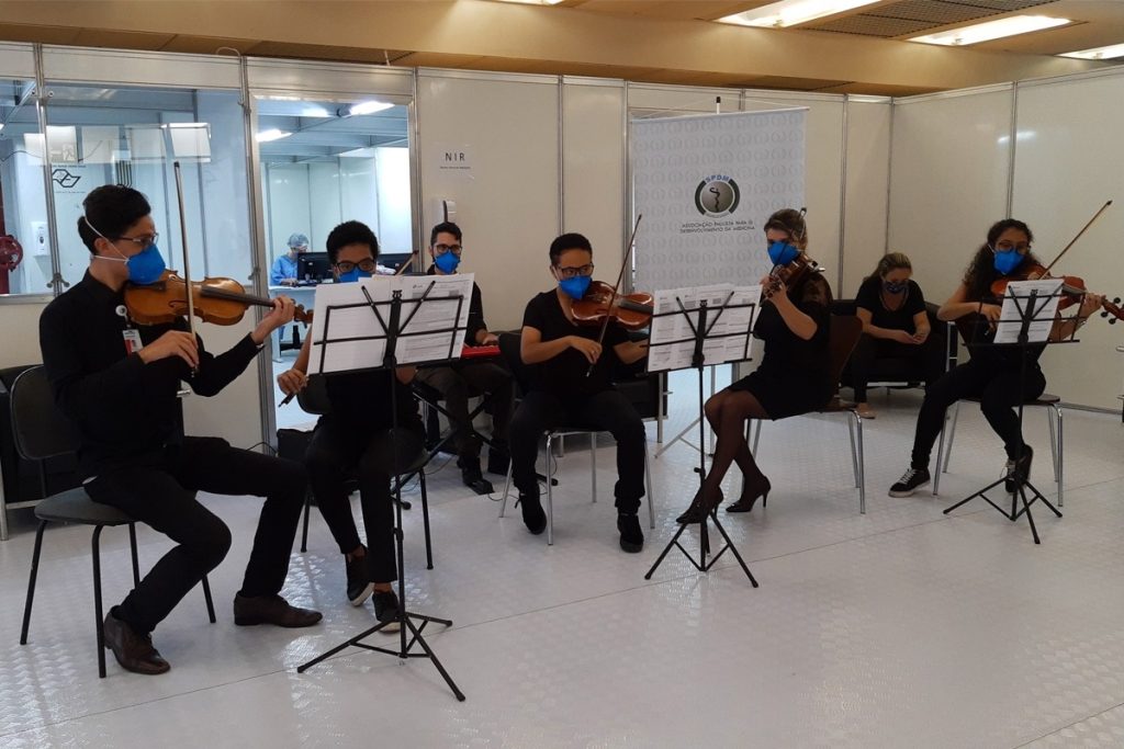 Na tarde da última sexta-feira (24), a SPDM – Associação Paulista para o Desenvolvimento da Medicina, que administra, em parceria com a Prefeitura de São Paulo, 310 leitos para pacientes de baixa e média complexidade com Covid-19 do Hospital Municipal de Campanha (HMCamp) Anhembi, realizou uma iniciativa diferente aos pacientes e colaboradores da unidade – cinco violinistas e um tecladista realizaram uma performance na unidade, repleta de músicas que acalmaram e emocionaram a todos os presentes.
