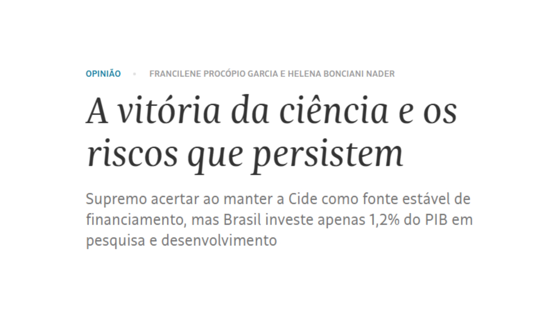 Em artigo intitulado “A vitória da ciência e os riscos que persistem”, publicado no jornal Folha de São Paulo em 8 de setembro, Francilene Procópio Garcia, Presidente da Sociedade Brasileira para o Progresso da Ciência (SBPC) e Helena Bonciani Nader, Presidente da Academia Brasileira de Ciências (ABC) discorrem a respeito da decisão do Supremo Tribunal Federal (STF) a respeito da constitucionalidade da Cide (Contribuição de Intervenção no Domínio Econômico) sobre remessas ao exterior.